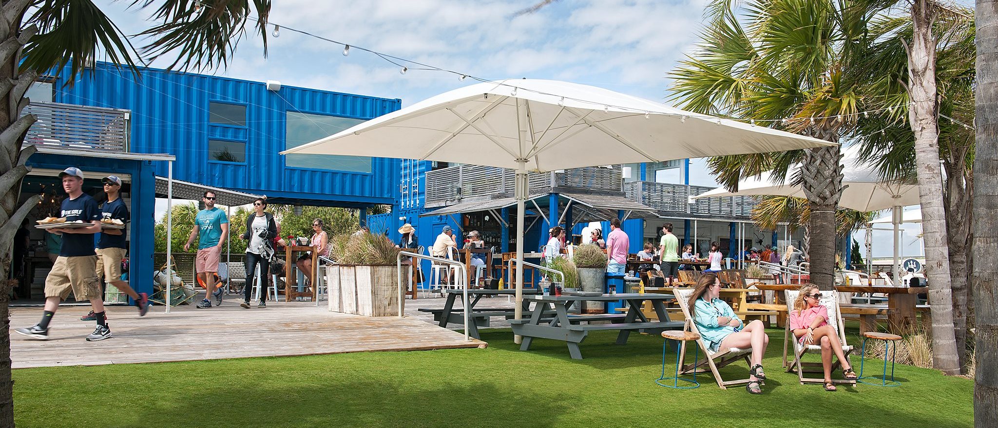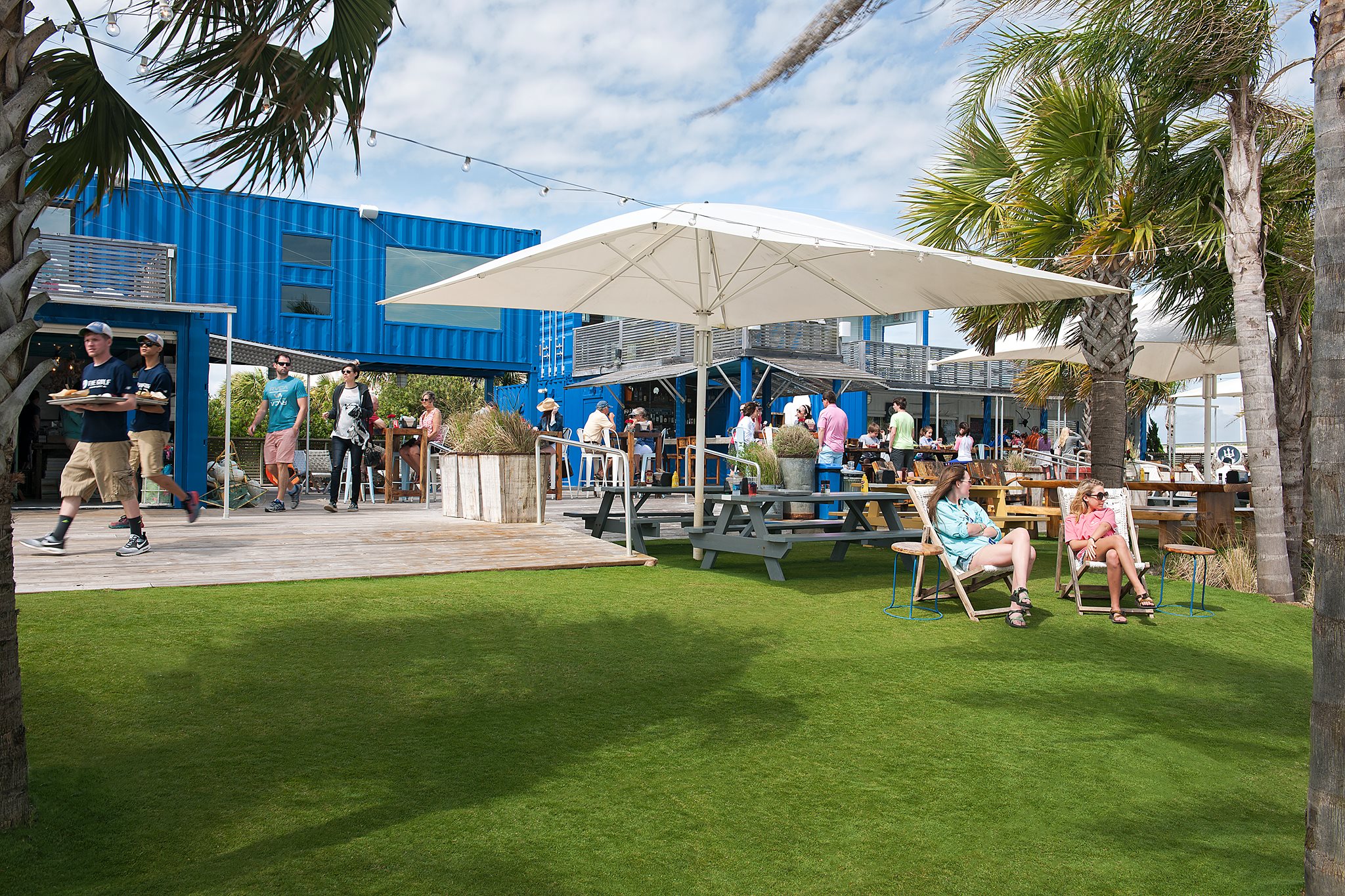 The design features shipping containers, reclaimed, recycled and salvaged building materials that contrast attractively and good-naturedly with the sand, surf and