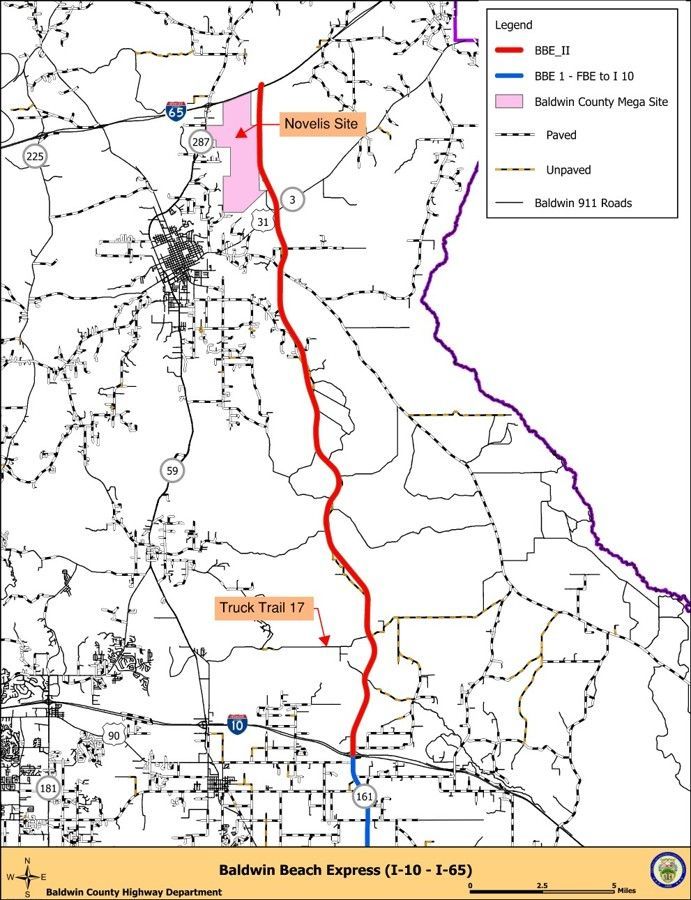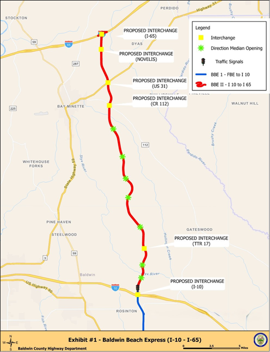 The Baldwin Beach Express II corridor is planned as a 25-mile, multi-lane, divided highway connecting Interstate 10 to Interstate 65. The project is designed to link three U.S. routes, ease regional traffic congestion, support emergency evacuation routes, and advance the county’s long-term infrastructure goals.